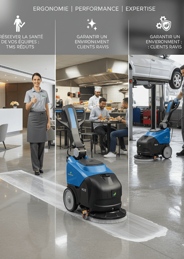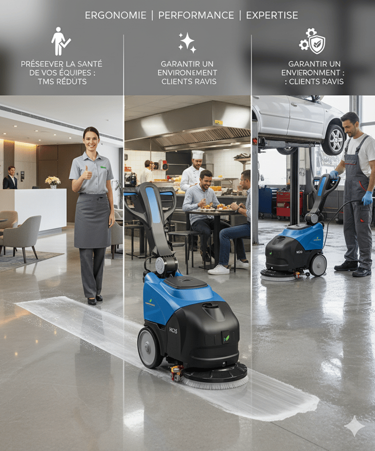 Le nettoyage manuel est une source majeure de Troubles Musculo-Squelettiques (TMS) pour vos collaborateurs. Notre objectif principal est de réduire drastiquement cette pénibilité en proposant des autolaveuses performantes et ergonomiques. En équipant vos équipes, vous investissez concrètement dans leur santé, leur sécurité et leur bien-être au travail, garantissant ainsi une meilleure qualité de vie et une fidélisation accrue de votre personnel.